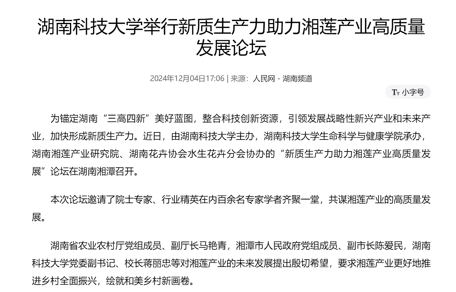 【人民网】湖南科技大学举行新质生产力助力湘莲产业高质量发展论坛
